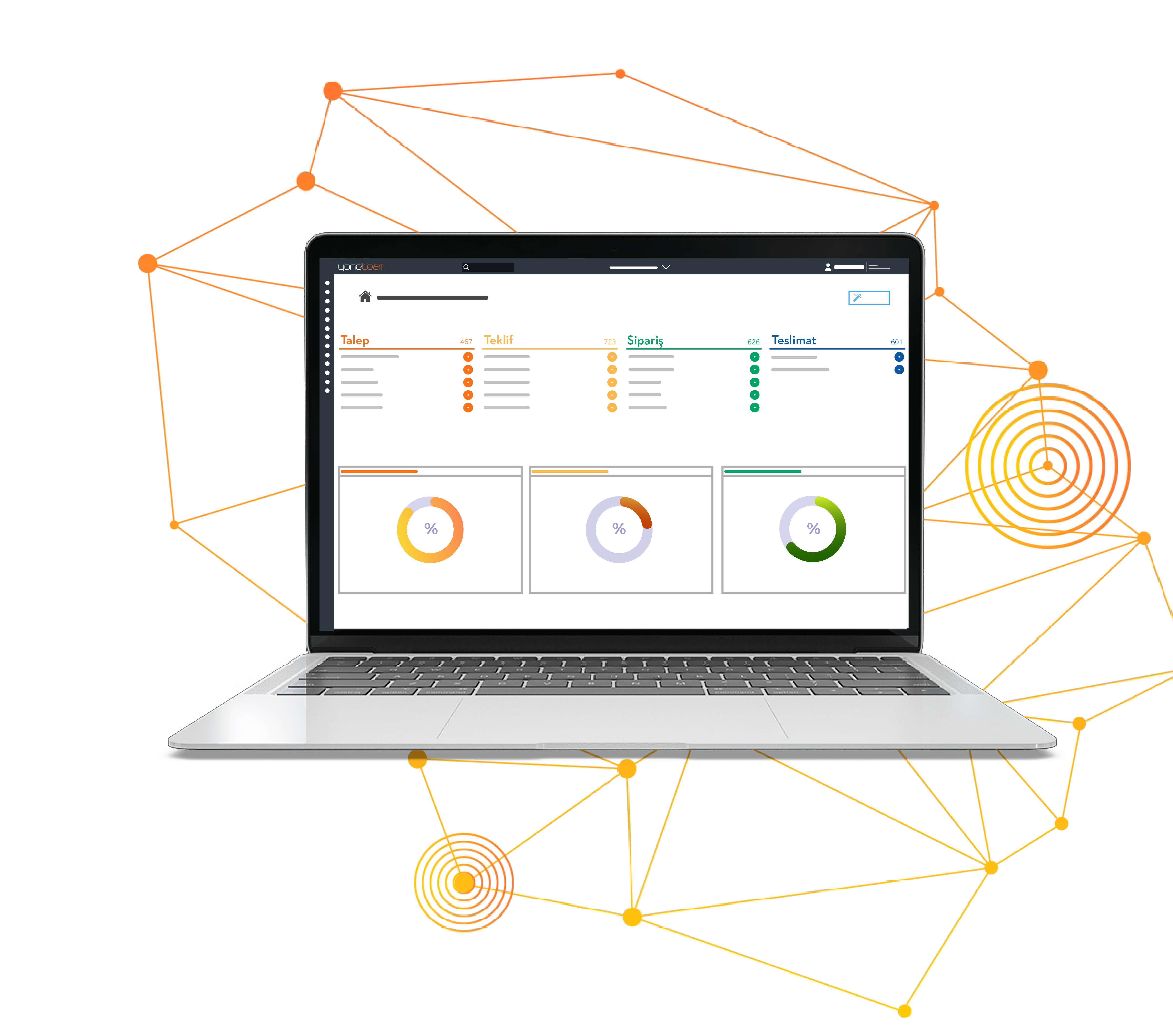 YoneTeam sayesinde talep, teklif, sipariş ve teslimat ile alakalı tüm veriler anlık olarak kolaylıkla ulaşılabilir hale gelir. Muhasebe gibi gerekli birimlere tüm işlemleriniz hakkında otomatik bilgi gider.