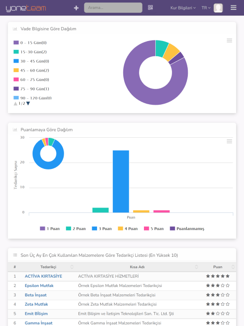 En fazla çalıştığınız tedarikçinizi, ne kadar sipariş verdiğinizi, ortalama ne kadar vade ile çalıştığınızı tek ekranda görebilirsiniz.