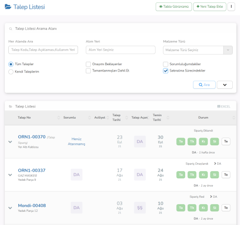 Projeyi, Alım Yerini, Talep Edeni veya Talep Malzeme Türünüzü seçerek hızlıca online talep formunuzu oluşturabilirsiniz. Talebi başka birimden kişiler açsa bile Talep Eden başlığı altında talepleri online olarak inceleyebilir, hızlıca aksiyon alabilirsiniz.