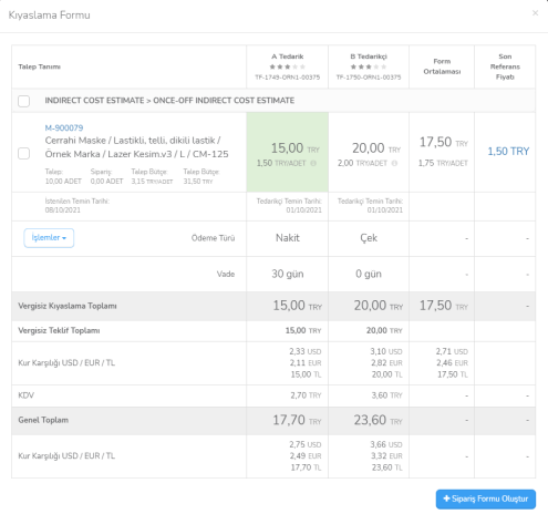 Tek tık ile malzemelerinizin eski sipariş fiyatını ve güncel birim fiyatlarını görebilir, yeni bir sipariş oluşturmadan önce tedarikçiniz ile pazarlık edebilirsiniz. Böylelikle pazarlık gücünüzü arttırarak, şirket içerisinde veri takip kültürü oluşturabilirsiniz.